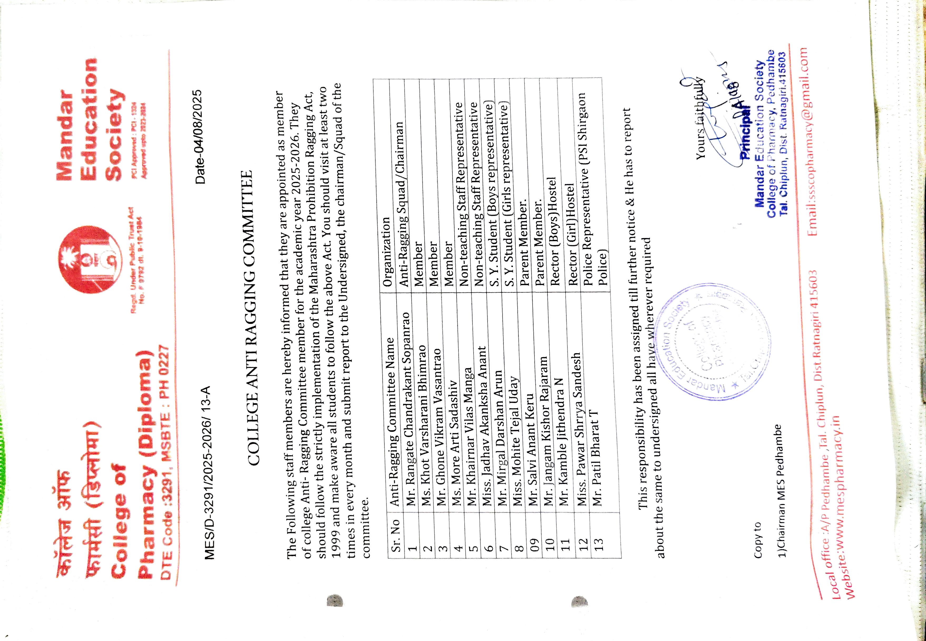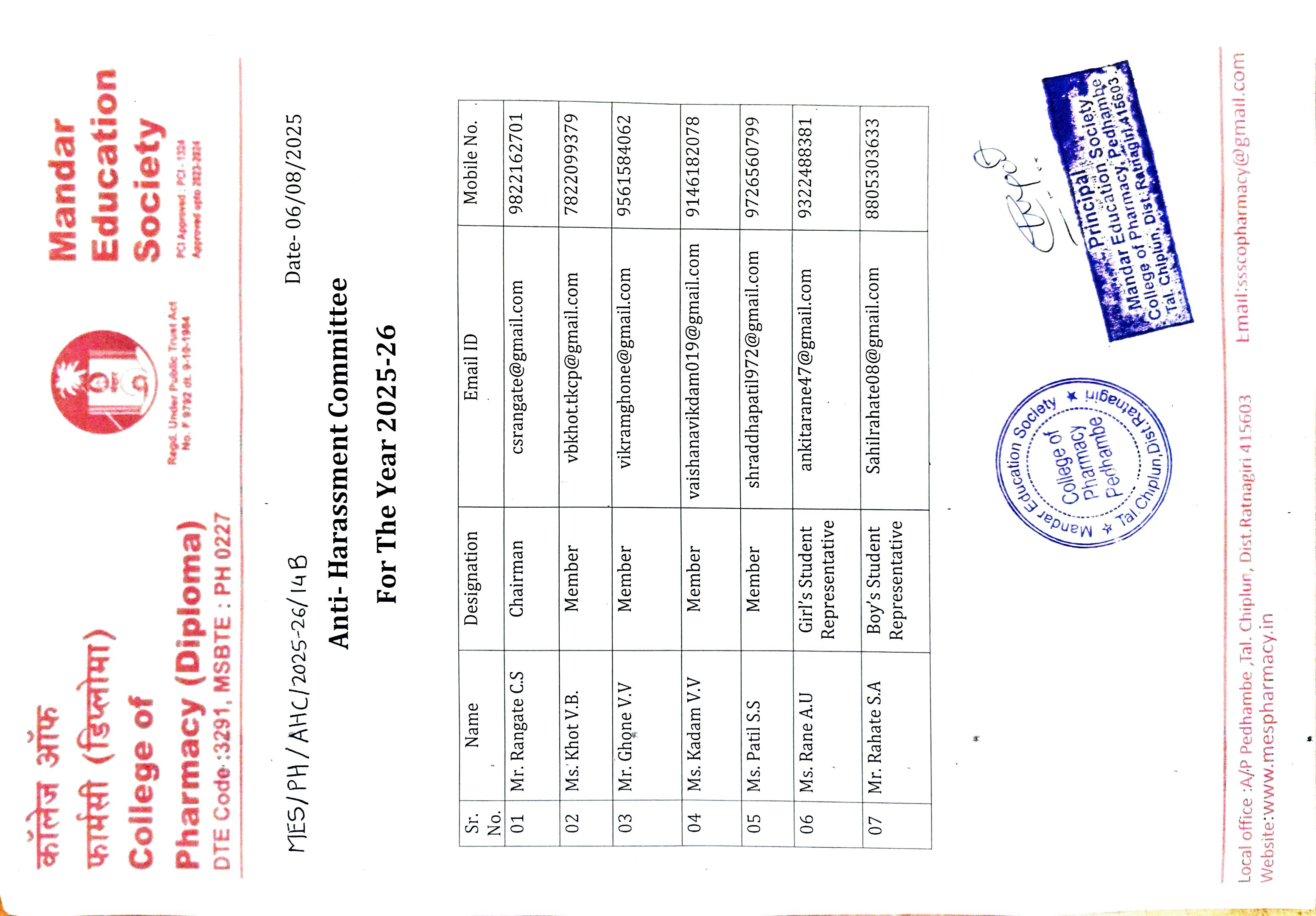 The Mandar Education Society’s College of Pharmacy (Diploma) established in 1986, MES college of Pharmacy, Pedhambe approved by AICTE, Pharmacy Council of India, DTE, MSBTE Govt of Maharashtra. Which provides highest quality instruction in pharmaceutical sciences. The mission of the MES college of Pharmacy is to strive for improving the health care system, not only in Konkan, but throughout Maharashtra and all over India to achieve this mission the students are inculcated with a strong foundation of knowledge essential to the pharmacy profession. Thus, the college assures to bring out dedicated, competent health care professionals to serve the community in the best possible ways.